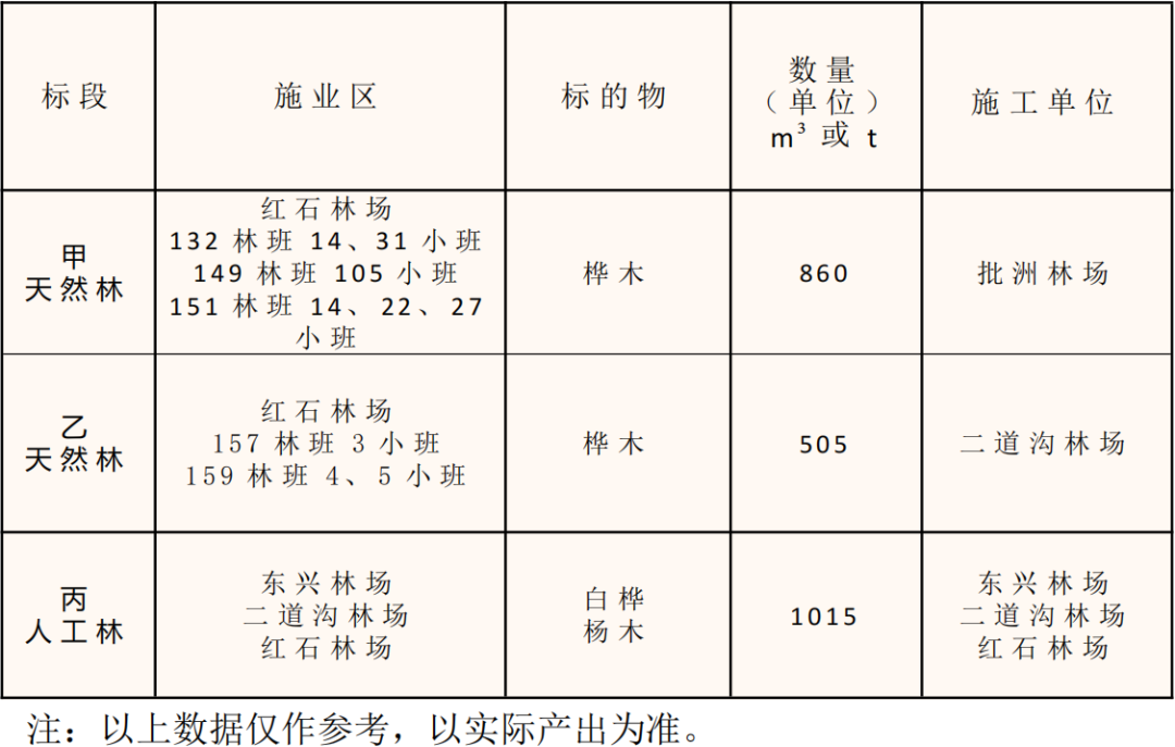 本次电话竞价销售标的为红林公司2023年森林可持续经营试点生产的原木和枝丫材,按山场位置分为多个标段。所有标的物分标段竞价出售,实际数量及质量经林场、验收站、购买方三方对检,并以发车小票签字无异议确认后为准。