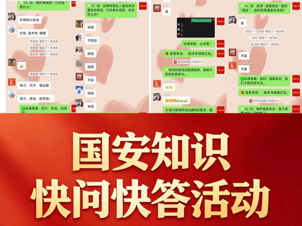 公司工会把国家安全教育纳入大思政课堂核心实践环节,精心组织线上国家安全知识快问快答活动,以轻量化、互动化的学习形式,引导全体工会干部主动学、深入学,切实达到以答促学、以学促行、以行践责的效果,推动总体国家安全观入脑入心,在全公司营造出“国家安全、人人有责、人人尽责”的浓厚宣教氛围。