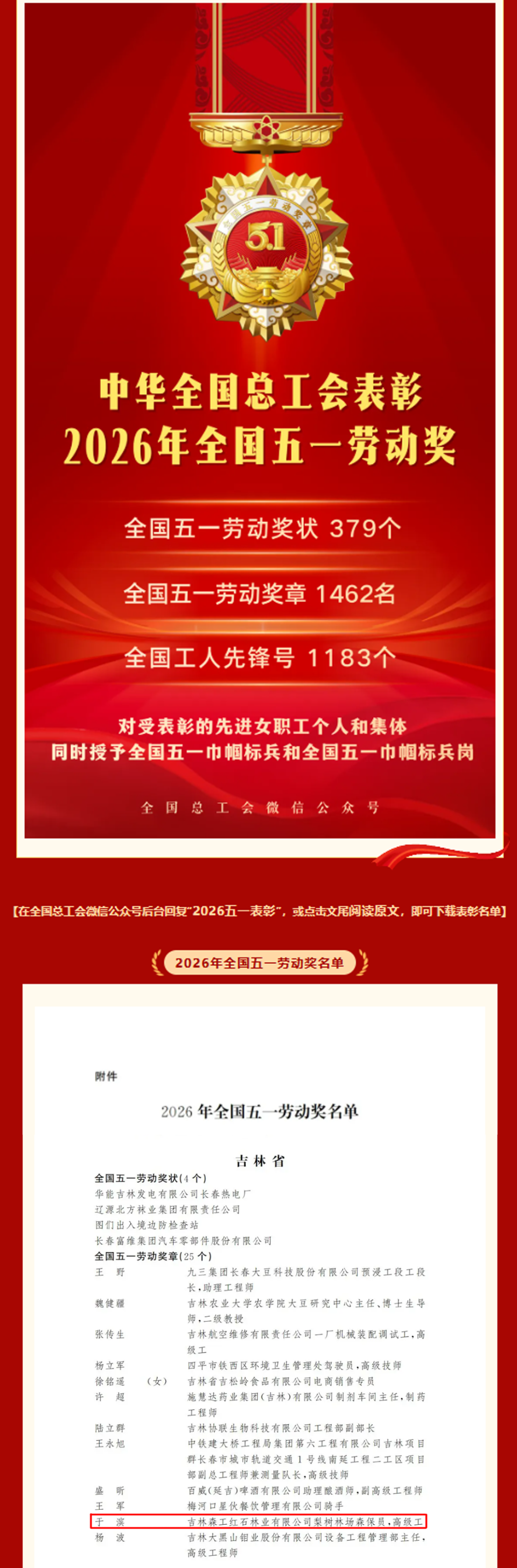 这份沉甸甸的奖章,既是对于滨同志二十六年扎根林海、深耕森防一线的最高褒奖,也是吉林长白山森工集团和红林公司厚植人才沃土、弘扬工匠精神的生动见证。