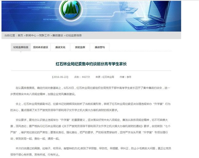 主持人:在认真排查摸底、确定约谈对象基础上,6月20日,局纪委组织全局党员干部中高考学生家长召开了集中廉政约谈会,进一步贯彻落实中央八项规定精神,加强企业党风廉政建设。