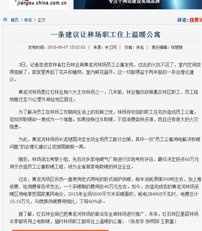 主持人:黄泥河林场为解决员工在林场工作期间生活上的后顾之忧,林场将收回的职工住宅改造成员工公寓,但取暖问题成为一个难题。经过林场全体员工献计出策,最终采纳“员工公寓用电解决取暖问题”的合理化建议。随后,林场派出考察小组,先后对多家电暖气厂商进行实地考核评估,最终决定投资60万元用于改造员工公寓取暖工程,成为全省首家电取暖的林业企业。